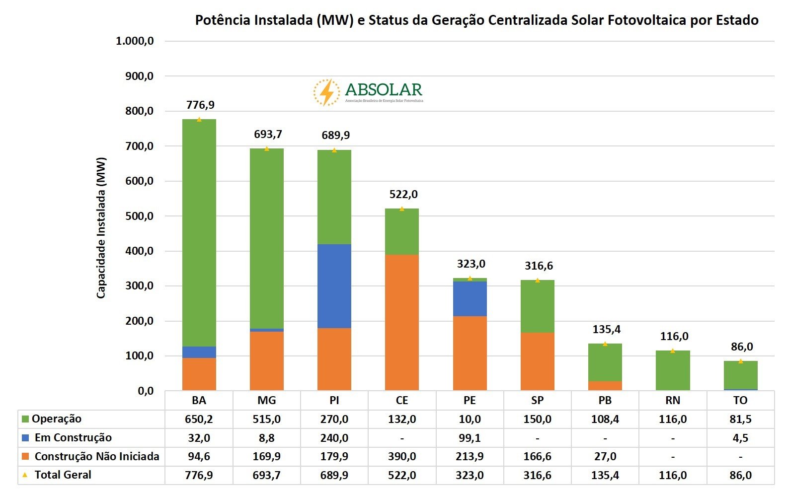 O Brasil possui hoje usinas solares fotovoltaicas de grande porte operando em 9 estados nas regiões Nordeste, Sudeste e Norte do País, com destaque para Bahia, Minas Gerais e Piauí.