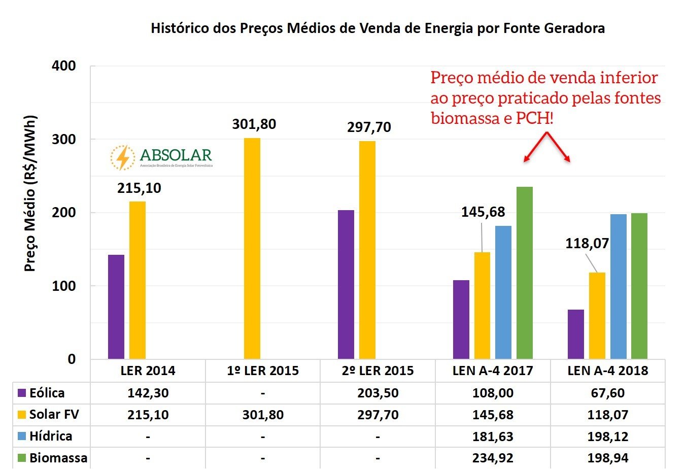 A fonte solar fotovoltaica tem apresentado forte queda de preços, o que permitiu que a tecnologia atingisse um novo patamar de competitividade a partir do leilão de energia nova A-4 de 2017. Desde então, a fonte tem ofertado energia elétrica a preços médios inferiores aos praticados por outras renováveis, como a biomassa e as pequenas centrais hidrelétricas (PCHs).